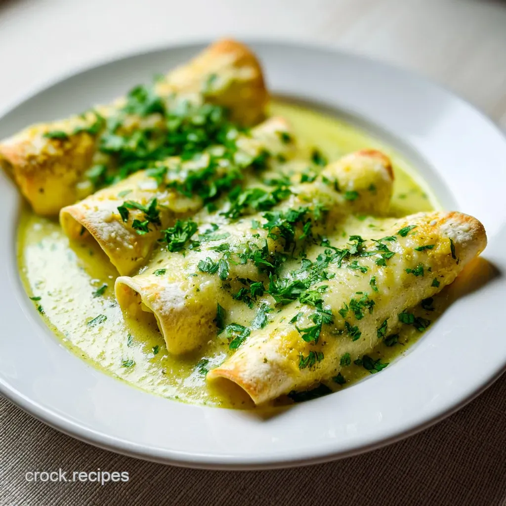 A vibrant green salsa made from charred tomatillos, serranos, onions, and garlic is the foundation. This blend is simmered and emulsified with Mexican crema to create a stable, creamy sauce that coats the chicken filled tortillas perfectly.